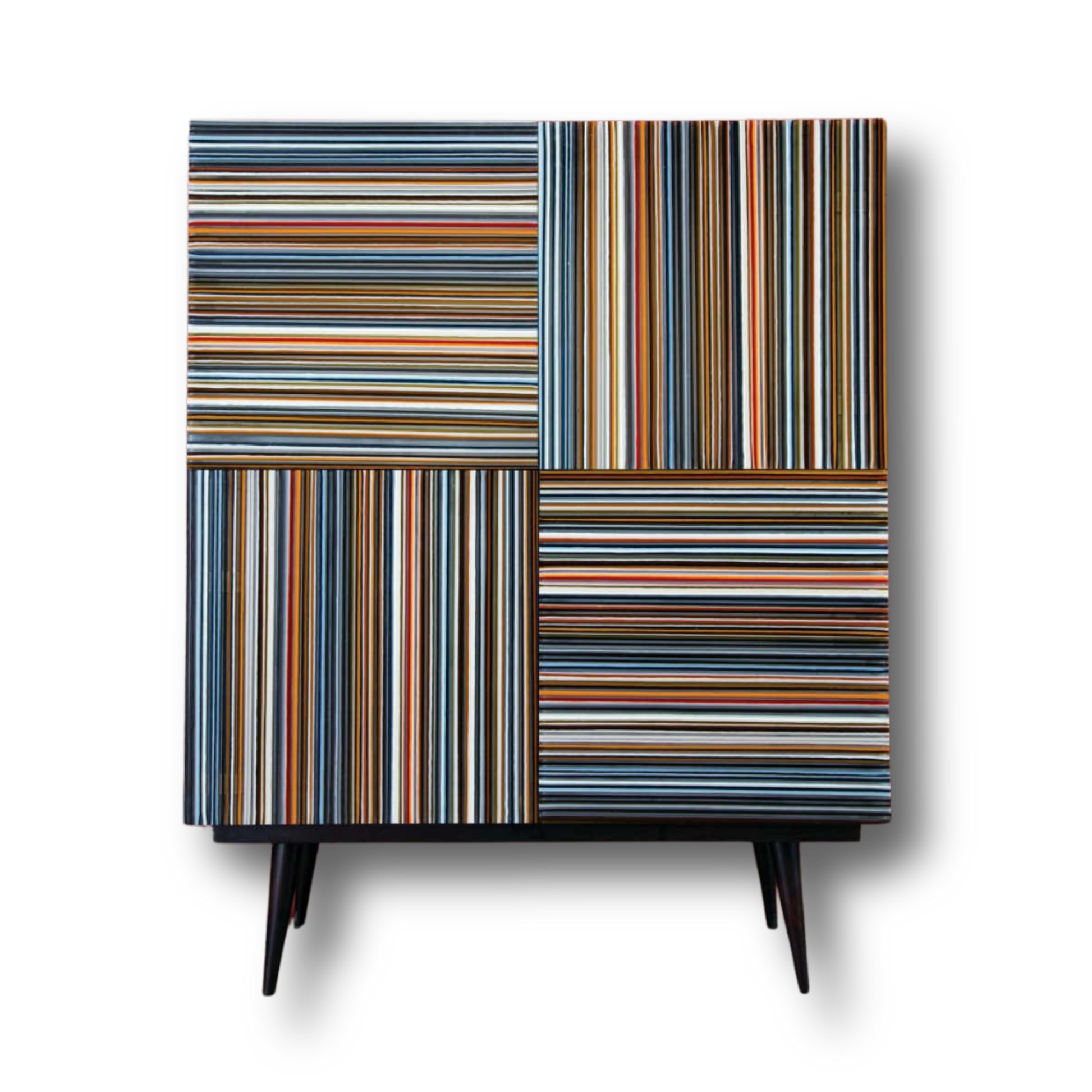 Ce bar au design funky se distingue par ses rayures multicolores dynamiques et ses motifs graphiques alternant lignes verticales et horizontales. Monté sur des pieds fuselés noirs, il allie style moderne et fonctionnalité, offrant un rangement élégant pour vos bouteilles et accessoires tout en ajoutant du caractère à votre espace.