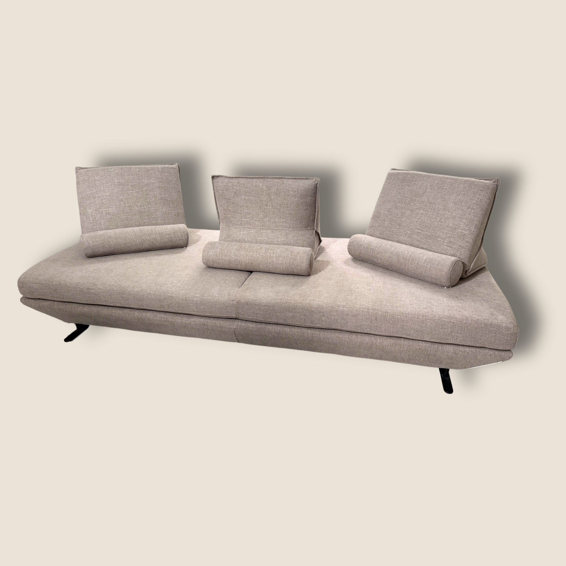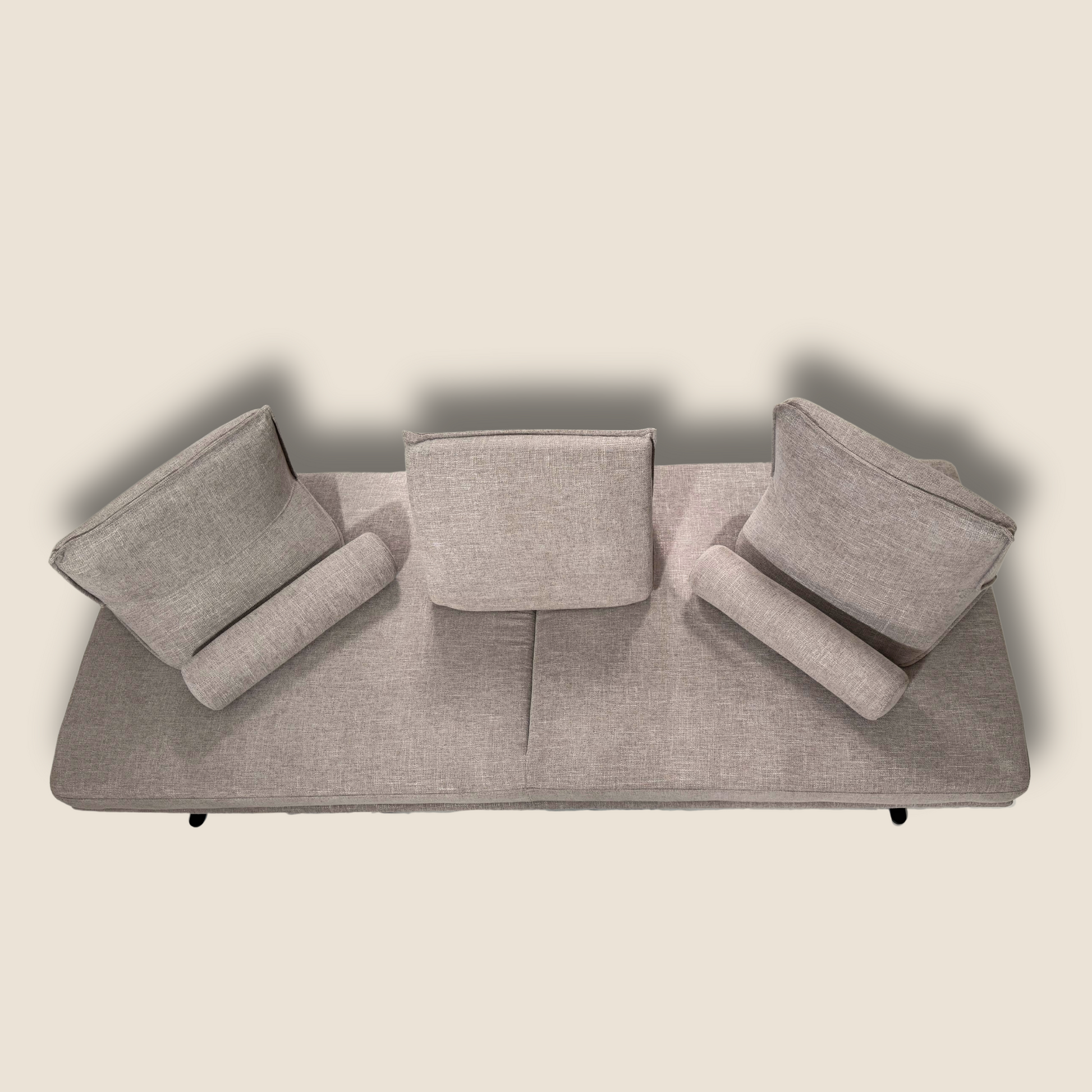 Ce canapé consiste en une vaste banquette associable et modulable à volonté, sur laquelle on dispose librement des coussins de dossier pour s'installer au gré de ses envies. Et cette liberté est totale puisque ces coussins, lestés et équipés d'un système antiglisse, n'ont besoin d'aucun point d'appui ou d'accroche pour être maintenus. On peut donc même imaginer de les disposer au sol, pour un moment de farniente autour d'une table basse, pendant que la banquette pourra faire office de couchage d'appoint en retournant son coussin d'assise, recouvert au verso, d'un coutil de matelas.