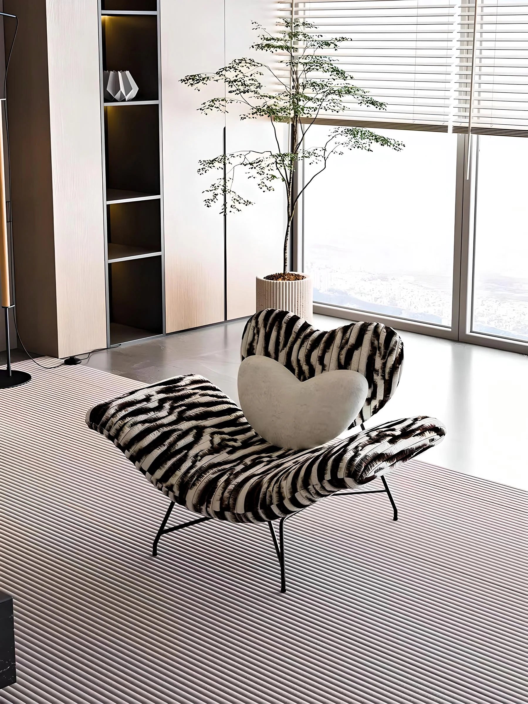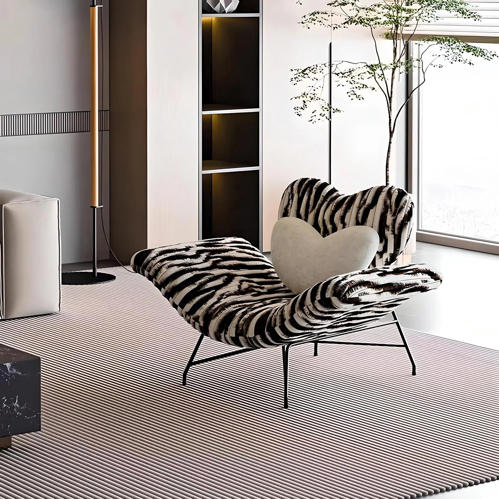 Le fauteuil "Savannah" se distingue par son audacieux motif zébré en fausse fourrure, ajoutant une touche sauvage et luxueuse à votre intérieur. Sa forme généreuse et incurvée offre un confort exceptionnel, tandis que ses pieds fins en métal noir apportent une légèreté visuelle moderne. Parfait pour les intérieurs contemporains, ce fauteuil original est une pièce maîtresse qui attire tous les regards et crée une ambiance élégante et exotique dans votre salon.